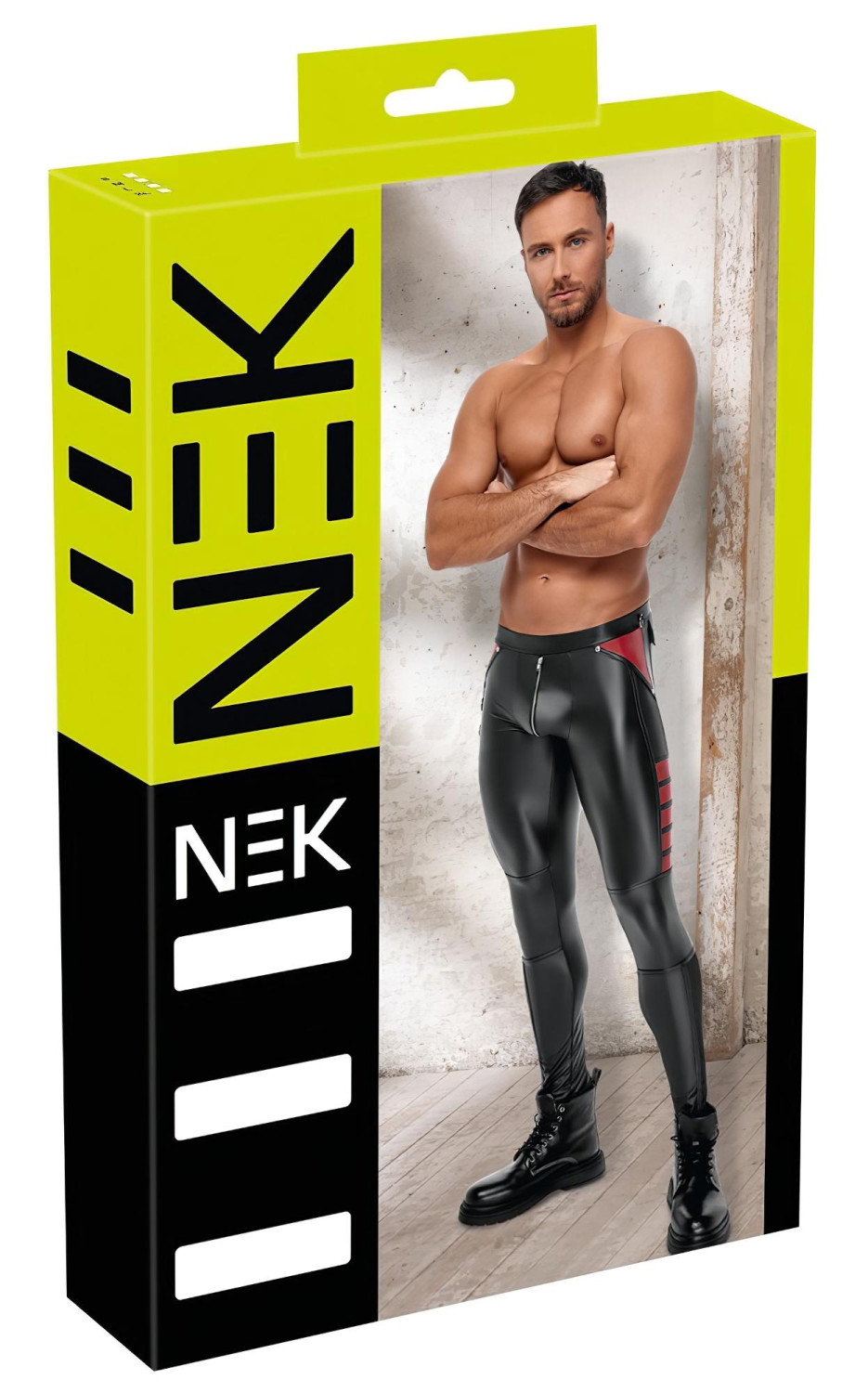 • Sexy design: Výrazné nýtky a kroužky, doplněné červenými a síťovanými vsadkami - ideální pro milovníky dominantního stylu.