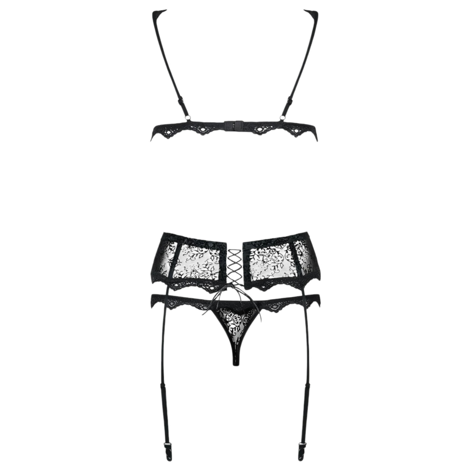 Bohatě zdobený, tří­dílný set spodního prádla z úplně průhledného materiálu s jemnými, drobnými výšivkami - pro všechny, kdo milují vytříbeně sexy styl!